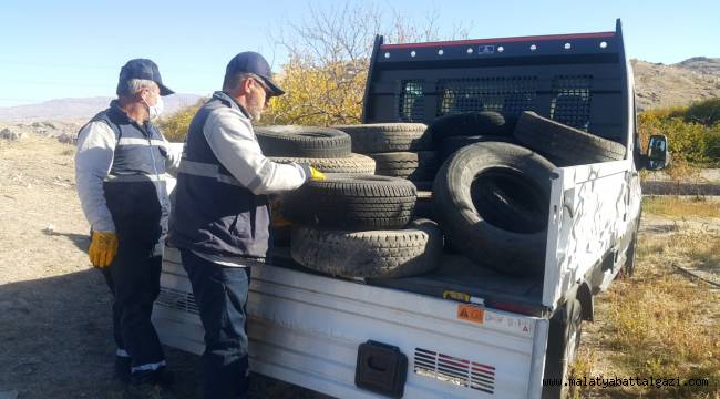 Malatya Büyükşehir Belediyesi Çevre Koruma ve Kontrol Daire Başkanlığı ekipleri tarafından çevreye rastgele atılan atık lastikler toplanıyor.